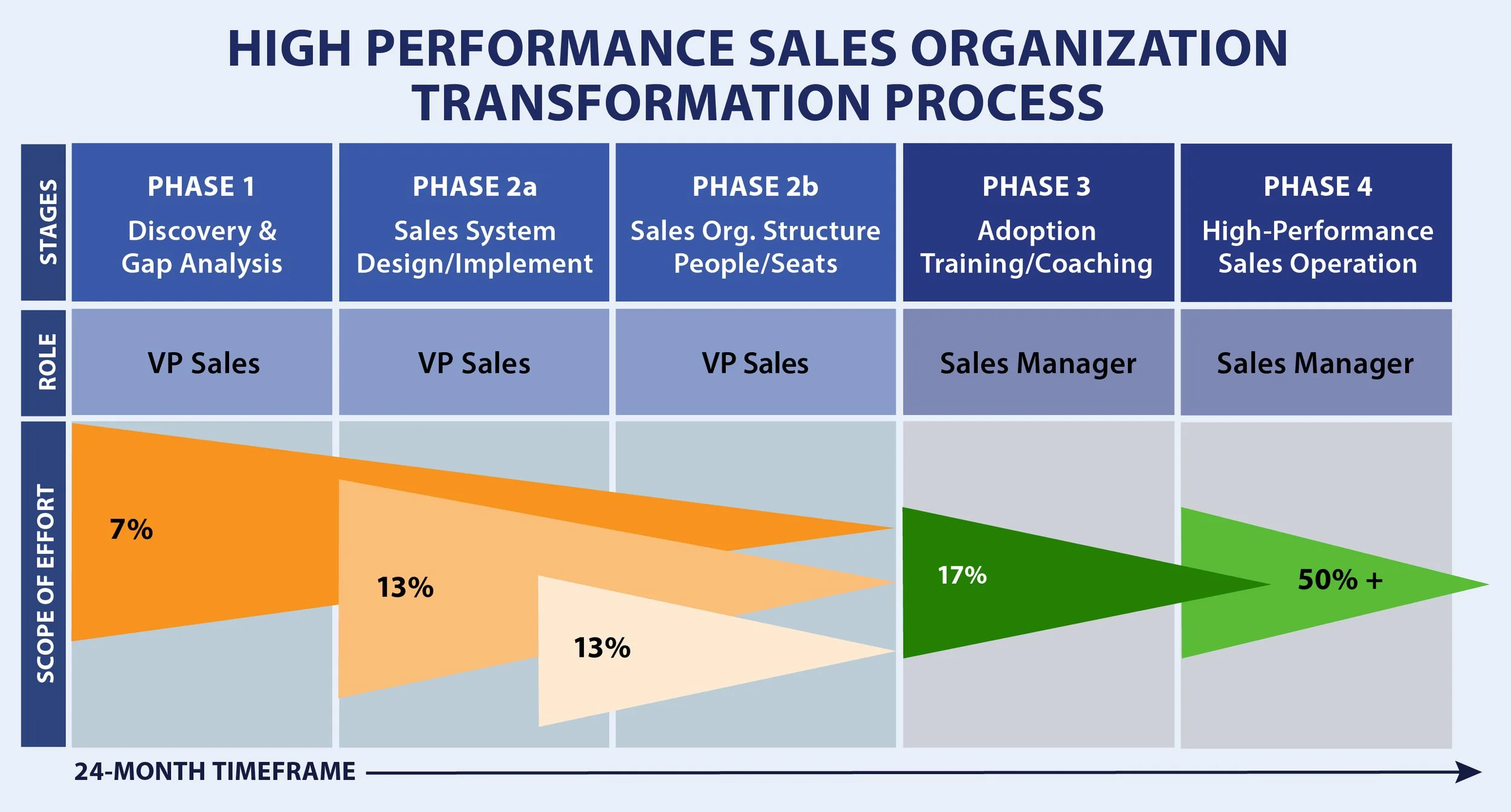 As outlined in my illustration, the VP Sales role paves the way with executive-level expertise to establish a best practice sales platform during Phases 1-2. While these activities only make up 33% of the transformation process, they are foundational in enabling high performance sales results.